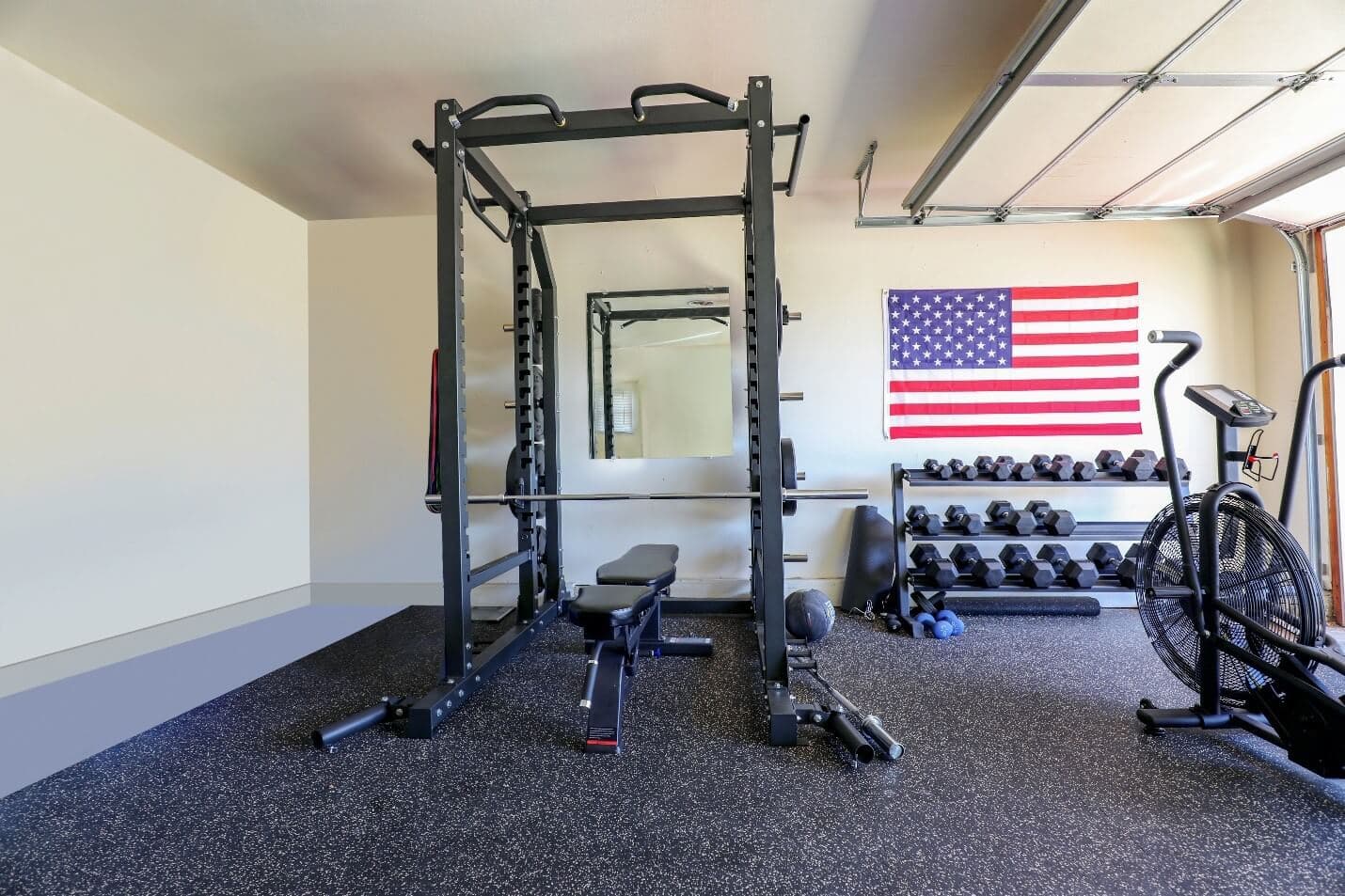 The Woods were looking for a garage gym setup that could meet all of their needs, so they contacted us for the BodyKore Garage Gym package. This package includes a full squat cage and adjustable bench which allowed them to do all the strength training (ie: Squat, Deadlifts, Bench Presses, Shoulder Presses, Pull ups, Dips as well as a lot of other free weight exercises), dumbbells for isolated strength training, an air rower for HIIT and cardio and 200sqft rubber flooring which covers half of their 2 car garage.